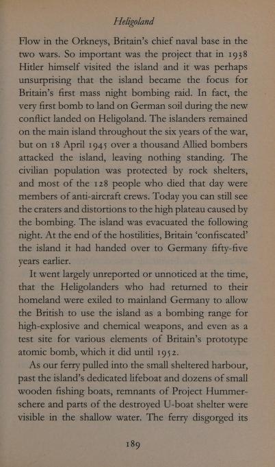To round things off, I found this chapter in Ben Fogle's "Offshore : in search of an island of my own". The book describes itself as "the story of an incredible, inspiring journey round the rim of the British Isles", ignoring the fact that Heligoland was returned to Germany in 1952.